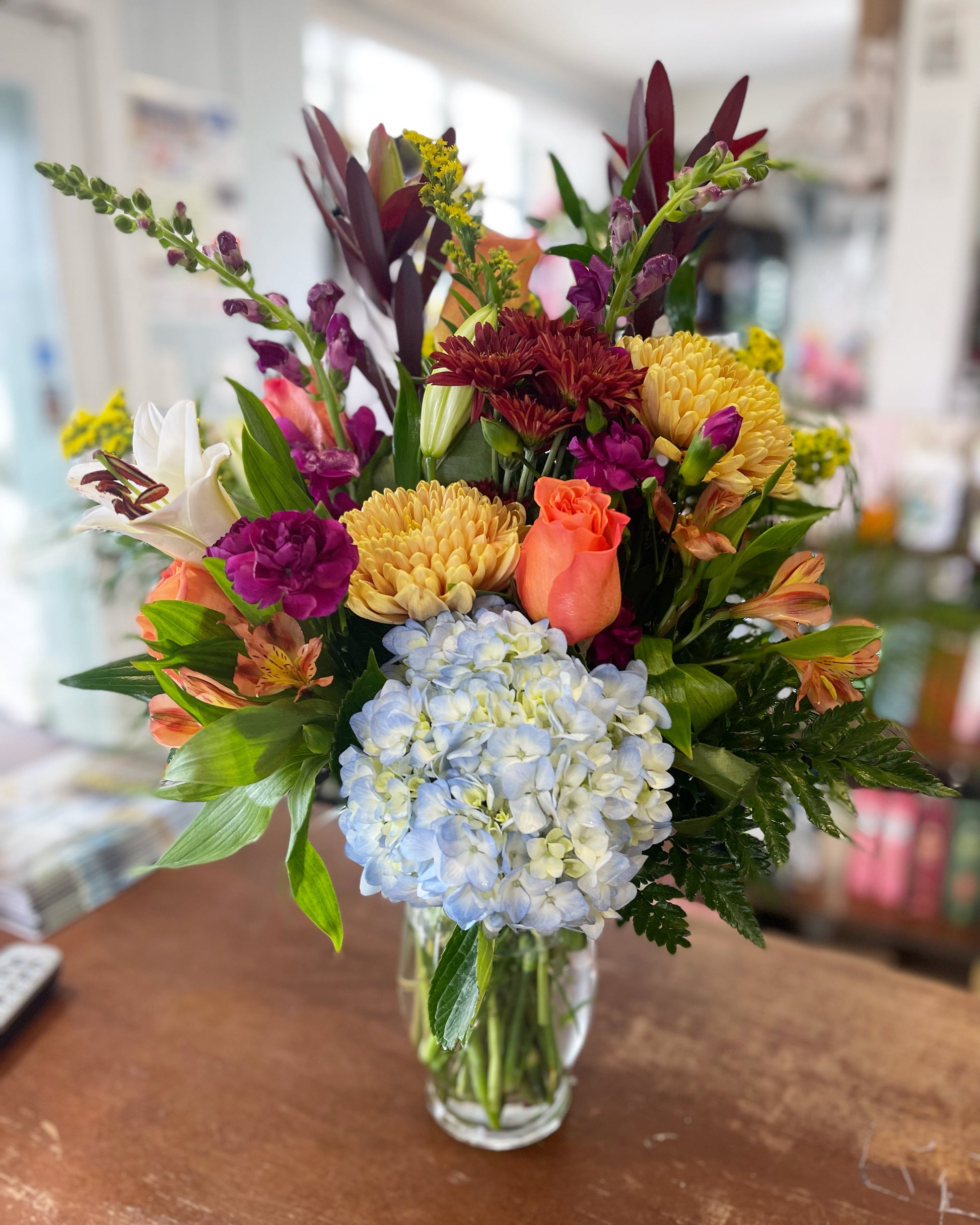 This arrangement features a beautiful array of flowers according to what is fresh. It may be in a tall or short vase. Greenery may vary from arrangement to arrangement depending on availability. To request something specific, please call our store to order.