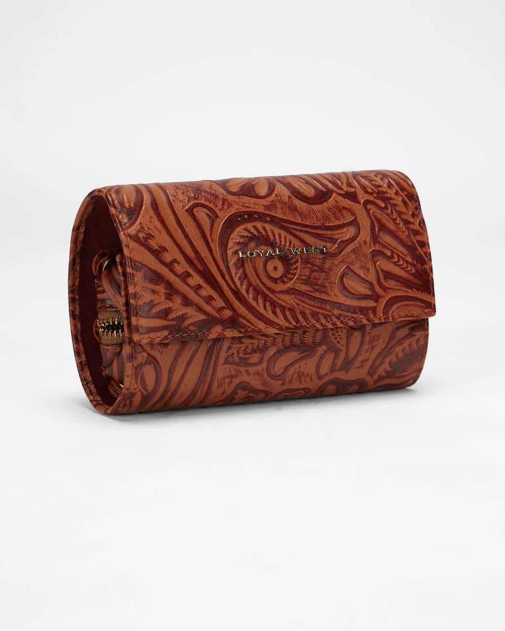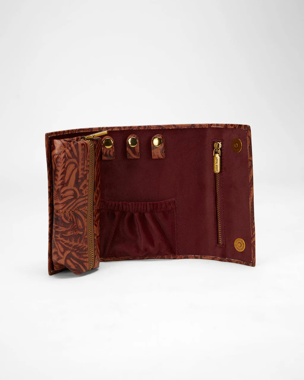The Canyon Jewelry Case in brown is a striking blend of rustic charm and practicality. Made from hand-finished embossed leather – brown, it features a full embossed design that adds texture and character to this small jewelry organizer. Perfect for keeping your accessories neatly stored, this case combines durability with a unique, natural aesthetic. Its compact size and distinctive look make the Canyon Jewelry Case an elegant addition to your collection, whether at home or on the go.