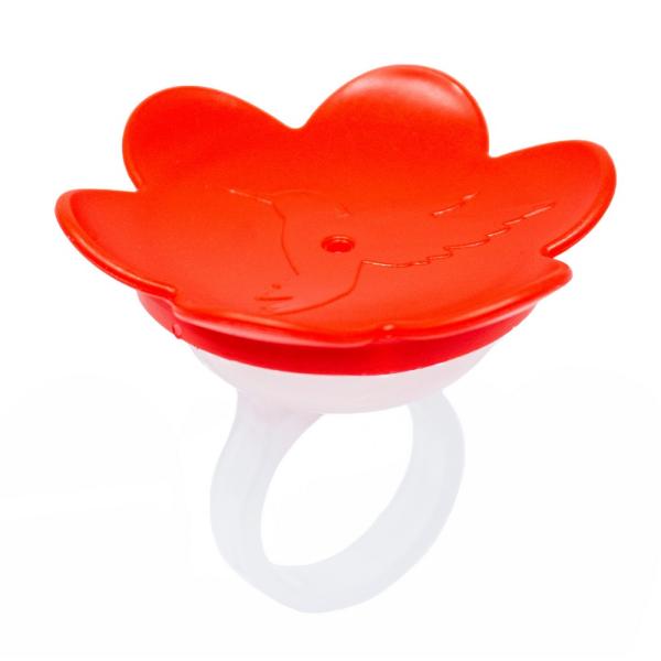 Feed Hummingbirds out of your hand. Use with any nectar, great for children and seniors. Holds 0.3oz/10 milliliters of nectar, top rack dishwasher safe. Place in a plant pot initially, once birds become acclimated to the feeder you can use as a ring. By standing still and extending your arm it will invite these wonderful birds to land and take nectar. Cap lifts of base for easy cleaning. Made in the USA.
