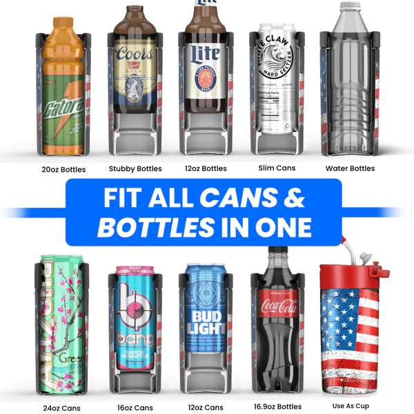 Now fits 12OZ CANS, SLIM CANS, BOTTLES, 16OZ CANS & BOTTLES, along with 20oz BOTTLES & 24oz CANS!